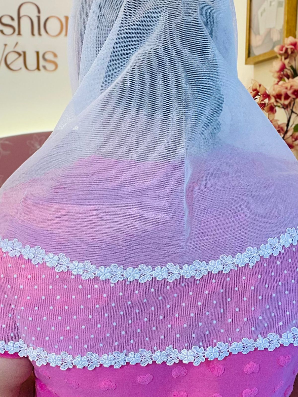 Expresse sua fé com delicadeza e propósito usando o Véu Rose da Fashion Véus. Confeccionado com materiais de alta qualidade, este véu combina suavidade, caimento perfeito e um design exclusivo. Ideal para momentos de oração, cultos ou uso diário, ele traz um toque de originalidade ao seu visual cristão. A renda refilada pelo lado avesso do tule de filó deixa o modelo desse véu exclusivo e delicado.